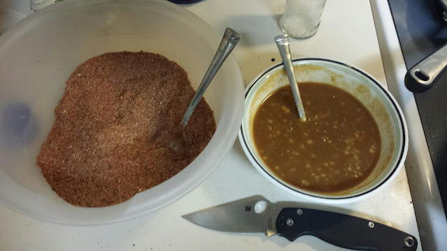 That's not burnt--that's spiced, blackened bacon, that tastes slightly sweet from the mop sauce. You can see part of the "smoke ring" where the meat appears pink/red. It came out tender, and not too dry. The guys passed verdict on it as Tasty and Fit for Human Consumption! Though they did think the cayenne pepper needs to be reduced down to a total of 1/2T. I had already cut it down from the suggested 2T to only 1T, but that proved a little warm still. I guess it all turned out ok, and the left overs (actually the entire big brisket is left overs...) are making for some tasty sandwiches for lunch today.